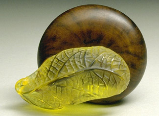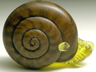 The tiny snail crawls on the shell of a larger snail, which is crawling on a leaf.