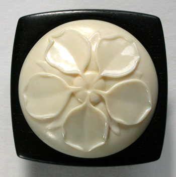 An apple blossom is carved in shallow relief on the lid of this small manju style netsuke.