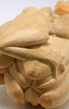 Ukibori: raised bumps on the skin of the frogs, results from compression of the wood, shaving/sanding down to the finished depth, then raised with an application of hot water.