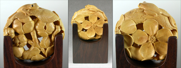 #417 Apple Blossom Peeper Ryusa Netsuke, 2008 Material: French Boxwood Eye Inlay: Baltic Amber Stand: Rosewood