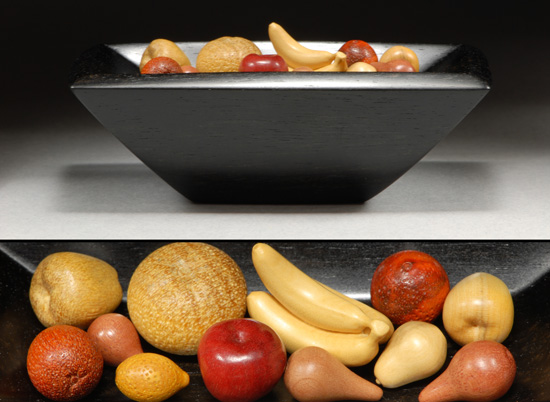 All the fruit except the bananas were first turned on a lathe, then hand-carved.