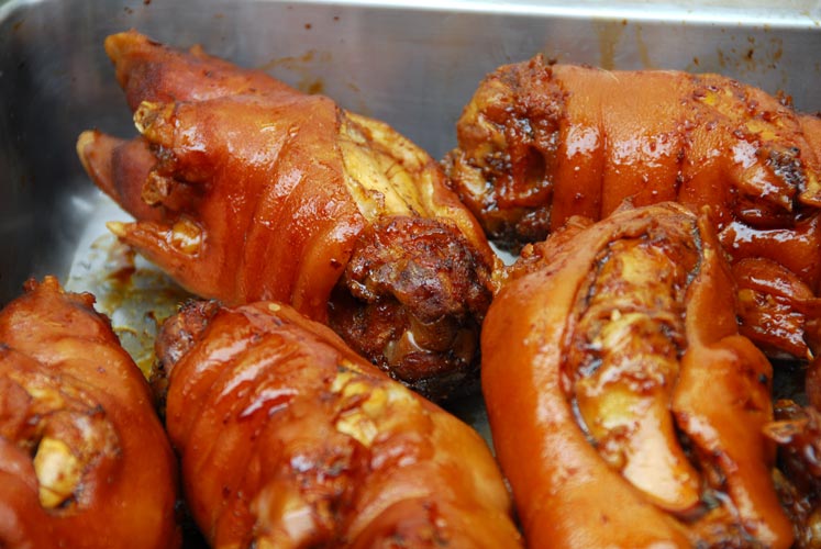 The shops are densely filled with the wares, foods, and shopping people. Along these