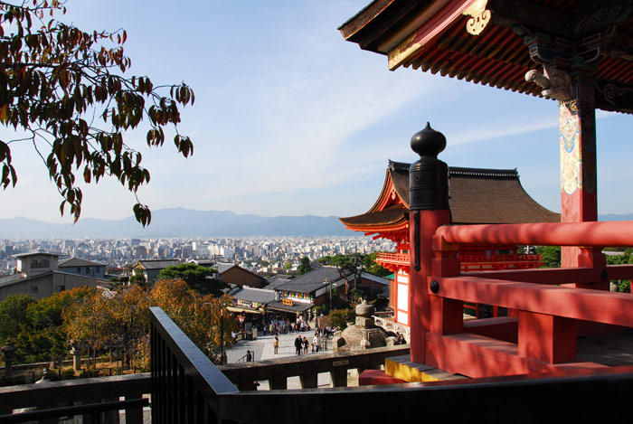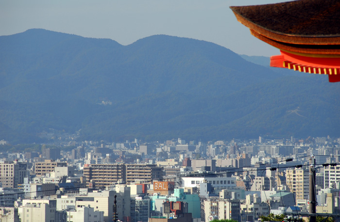 The city of Kyoto sits in a basin and has filled the valley between the mountains. Temples and shrines are built upon the mountain sides. This one offers spectacular views in all directions: the city, the temples, and the mountains.